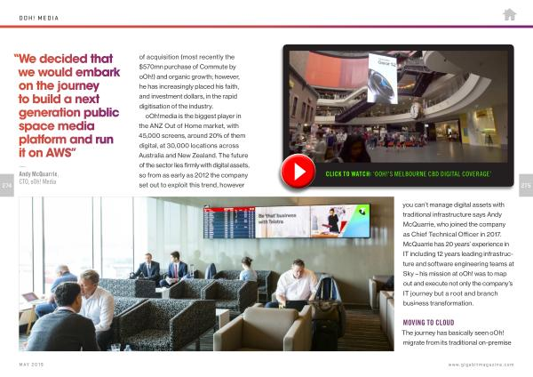 — Andy McQuarrie , CTO , oOh ! Media of acquisition ( most recently the $ 570mn purchase of Commute by oOh !) and organic growth ; however , he has increasingly placed his faith , and investment dollars , in the rapid digitisation of the industry . oOh ! media is the biggest player in the ANZ Out of Home market , with 45,000 screens , around 20 % of them digital , at 30,000 locations across Australia and New Zealand . The future of the sector lies firmly with digital assets , so from as early as 2012 the company set out to exploit this trend , however