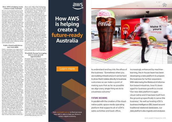 Woodside Energy is the pioneer of the liquefied natural gas ( LNG ) industry in Australia , and the largest Australian natural gas producer . Woodside ’ s producing LNG assets in Australia ’ s north-west Pilbara region are among the world ’ s best facilities , renowned for their safety , reliability and efficiency . Now , Woodside is seeking to create an integrated LNG production centre – the Burrup Hub - that would see new Scarborough and Browse gas resources processed through the Woodsideoperated Pluto LNG and Karratha Gas Plant . To help realise this vision , Woodside is leveraging gains from its data science and intelligent asset work programs over weeks and days , instead of months and years , allowing the company to make decisions sooner , using richer data . Innovation has always been part of Woodside ’ s DNA . Applying cloud technology is helping Woodside accelerate the traditional oil and gas project innovation cycle from years , down to months . Woodside uses AWS cloud as the foundation for optimising production in real time , by running high -speed algorithms to uncover new insights and opportunities to deliver extra value . Woodside can run 10,000 algorithms per hour , taking data from over 200,000 sensors attached to its Pluto LNG plant . The company remains focused on reaching all Woodside employees with this work . Digital at Woodside is not just about ‘ gear ’; it ’ s honing and changing the way people work , with collaborative partnerships playing a key role .
