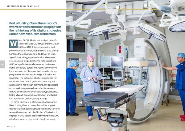 W hen BizClik Media last spoke to Nina Du Thaler she was CIO at Queensland Urban Utilities ( QUU ), the organisation that provides water to the greater Brisbane area . During her time there she was able to deliver Q-Ops , a platform that aggregates data from business systems into a single location to help operations staff manage Queensland ’ s sewer and water networks effectively , establish a robust governance framework across the organisation and a mature programme , and deliver a strategic ICT vision and roadmap . The outcome , a better experience for consumers and employees alike , was a great satisfaction to her , though if anything , she ’ s proudest of her work in improving team effectiveness and culture . She has never been a stereotypical techie , taking a broad view of her contribution , and that of the organisation , in the society at large .