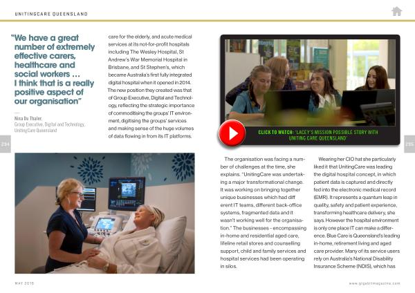 — Nina Du Thaler , Group Executive , Digital and Technology , UnitingCare Queensland care for the elderly , and acute medical services at its not-for-profit hospitals including The Wesley Hospital , St Andrew ’ s War Memorial Hospital in Brisbane , and St Stephen ’ s , which became Australia ’ s first fully integrated digital hospital when it opened in 2014 . The new position they created was that of Group Executive , Digital and Technology , reflecting the strategic importance of commoditising the groups ’ IT environment , digitising the groups ’ services and making sense of the huge volumes of data flowing in from its IT platforms .