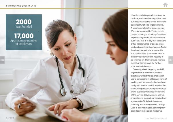 direction and design . A lot remains to be done , and many learnings have been surfaced but in some areas , there have been real functional improvements . A good example is the service desk . When she came in , Du Thaler recalls , people phoning in to UnitingCare were experiencing an abandonment rate of over 40 %, that is to say that calls were either not answered or people were kept waiting so long they hung up . Today the abandonment rate is below 3 %, and over 60 % of queries are fixed at the service desk without needing to be referred on . That ’ s a huge improvement , but there ’ s room for further improvement she says .