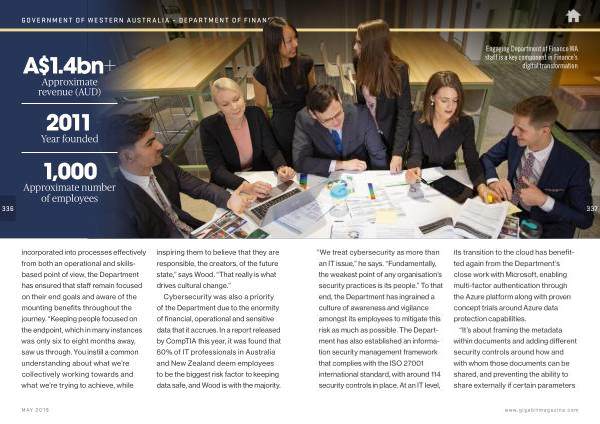 “ We treat cybersecurity as more than an IT issue ,” he says . “ Fundamentally , the weakest point of any organisation ’ s security practices is its people .” To that end , the Department has ingrained a culture of awareness and vigilance amongst its employees to mitigate this risk as much as possible . The Department has also established an information security management framework that complies with the ISO 27001 international standard , with around 114 security controls in place . At an IT level , its transition to the cloud has benefitted again from the Department ’ s close work with Microsoft , enabling multi-factor authentication through the Azure platform along with proven concept trials around Azure data protection capabilities .