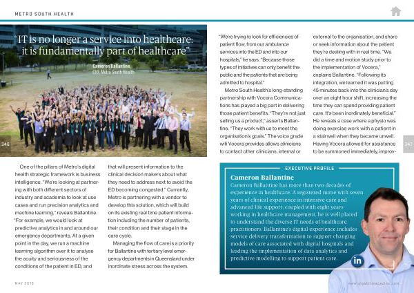 Metro South Health ’ s long-standing partnership with Vocera Communications has played a big part in delivering those patient benefits . “ They ’ re not just selling us a product ,” asserts Ballantine . “ They work with us to meet the organisation ’ s goals .” The voice grade wifi Vocera provides allows clinicians to contact other clinicians , internal or external to the organisation , and share or seek information about the patient they ’ re dealing with in real time . “ We did a time and motion study prior to the implementation of Vocera ,” explains Ballantine . “ Following its integration , we learned it was putting 45 minutes back into the clinician ’ s day over an eight hour shift , increasing the time they can spend providing patient care . It ’ s been inordinately beneficial .” He reveals a case where a physio was doing exercise work with a patient in a stairwell when they became unwell . Having Vocera allowed for assistance to be summoned immediately , improv-