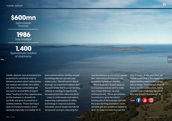 lobster , abalone , tuna and prawns are projected to contribute most to fisheries product export value across the medium term ( 2018 – 19 to 2022 – 23 ), where these commodities will account for around 80 % of export value ,” leading to further opportunities for the business to diversify its portfolio and grow its presence in existing markets . “ Prawn farming is quite an immature industry , and in Australia especially , is probably 10-15 years behind salmon farming , not just technologically but operationally ,” states Leary . “ We will now be able to leverage our expertise in salmon farming and transfer this to prawn farming , utilising technology to significantly increase production rates and yields .”
