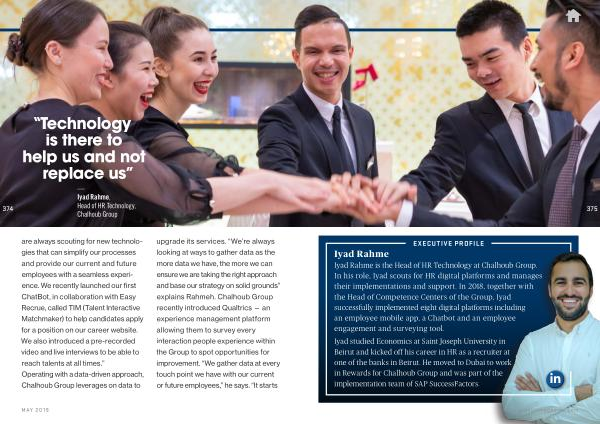 Iyad Rahme is the Head of HR Technology at Chalhoub Group . In his role , Iyad scouts for HR digital platforms and manages their implementations and support . In 2018 , together with the Head of Competence Centers of the Group , Iyad successfully implemented eight digital platforms including an employee mobile app , a Chatbot and an employee engagement and surveying tool . Iyad studied Economics at Saint Joseph University in Beirut and kicked off his career in HR as a recruiter at one of the banks in Beirut . He moved to Dubai to work in Rewards for Chalhoub Group and was part of the implementation team of SAP SuccessFactors .