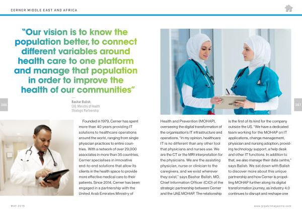 Health and Prevention ( MOHAP ), overseeing the digital transformation of the organisation ’ s IT infrastructure and operations . “ In my opinion , healthcare IT is no different than any other tool that physicians and nurses use . We are the CT or the MRI interpretation for the physicians . We are the assisting physician , nurse or clinician to the caregivers , and we exist wherever they exist ,” says Bashar Balish , MD , Chief Information Officer ( CIO ) of the strategic partnership between Cerner and the UAE MOHAP . The relationship is the first of its kind for the company outside the US . “ We have a dedicated team working for the MOHAP on IT applications , change management , physician and nursing adoption , providing technology support , a help desk and other IT functions . In addition to that , we also manage their data centre ,” says Balish . We sat down with Balish to discover more about this unique partnership and how Cerner is propelling MOHAP further along its digital transformation journey , as industry 4.0 continues to disrupt and reshape one