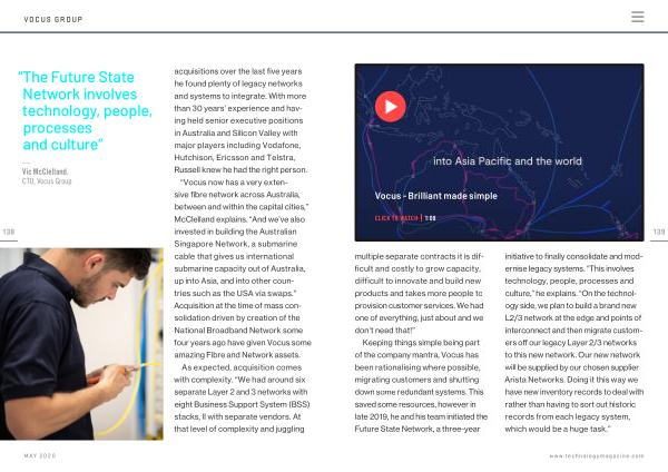 Keeping things simple being part of the company mantra , Vocus has been rationalising where possible , migrating customers and shutting down some redundant systems . This saved some resources , however in late 2019 , he and his team initiated the Future State Network , a three-year initiative to finally consolidate and modernise legacy systems . “ This involves technology , people , processes and culture ,” he explains . “ On the technology side , we plan to build a brand new L2 / 3 network at the edge and points of interconnect and then migrate customers off our legacy Layer 2 / 3 networks to this new network . Our new network will be supplied by our chosen supplier Arista Networks . Doing it this way we have new inventory records to deal with rather than having to sort out historic records from each legacy system , which would be a huge task .”