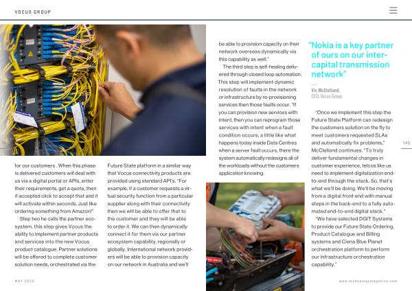 “ Once we implement this step the Future State Platform can redesign the customers solution on the fly to meet customers requested SLAs and automatically fix problems ,” McClelland continues . “ To truly deliver fundamental changes in customer experience , telcos like us need to implement digitalization endto-end through the stack . So , that ’ s what we ’ ll be doing . We ’ ll be moving from a digital front end with manual steps in the back-end to a fully automated end-to-end digital stack .”