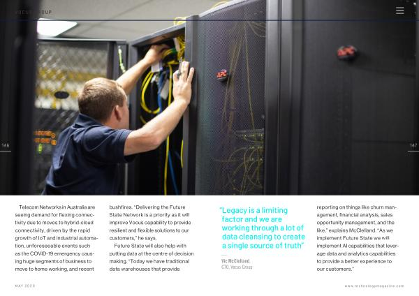 — Vic McClelland , CTO , Vocus Group reporting on things like churn management , financial analysis , sales opportunity management , and the like ,” explains McClelland . “ As we implement Future State we will implement AI capabilities that leverage data and analytics capabilities to provide a better experience to our customers .”