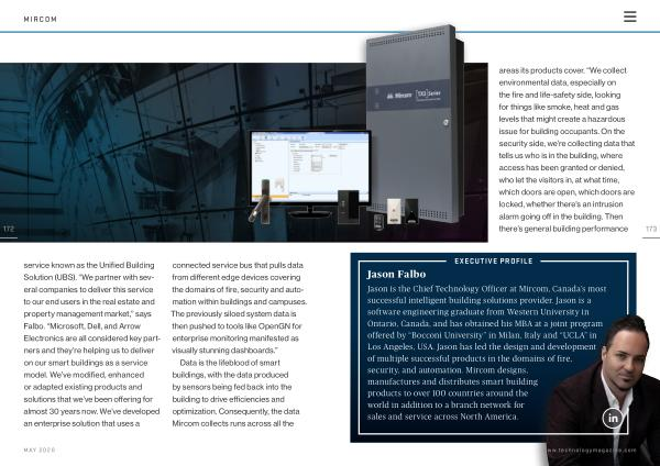172 service known as the Unified Building Solution ( UBS ). “ We partner with several companies to deliver this service to our end users in the real estate and property management market ,” says Falbo . “ Microsoft , Dell , and Arrow Electronics are all considered key partners and they ’ re helping us to deliver on our smart buildings as a service model . We ’ ve modified , enhanced or adapted existing products and solutions that we ’ ve been offering for almost 30 years now . We ’ ve developed an enterprise solution that uses a connected service bus that pulls data from different edge devices covering the domains of fire , security and automation within buildings and campuses . The previously siloed system data is then pushed to tools like OpenGN for enterprise monitoring manifested as visually stunning dashboards .”