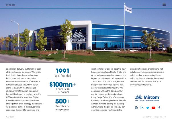 Due to such an approach , Mircom has positioned itself as a go-to partner for the real estate industry . “ We see ourselves as the digital consultant for people putting up buildings today ,” says Falbo . “ If you ’ re looking for financial advice , you find a financial advisor . If you ’ re looking for building advice , we ’ re the people that you can count on to guide you through the considerations you should have , not only for providing application specific solutions , but also ensuring those solutions form a cohesive , integrated environment for the needs of your occupants and tenants .” www . technologymagazine . com