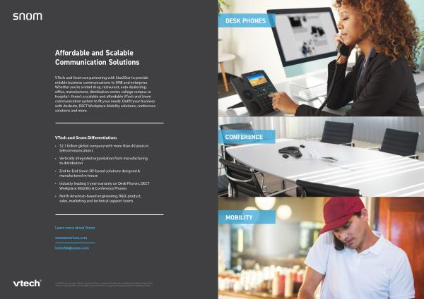 VTech and Snom are partnering with Star2Star to provide reliable business communications to SMB and enterprise . Whether you ’ re a retail shop , restaurant , auto dealership , office , manufacturer , distribution center , college campus or hospital - there ’ s a scalable and affordable VTech and Snom communication system to fit your needs . Outfit your business with desksets , DECT Workplace Mobility solutions , conference solutions and more .