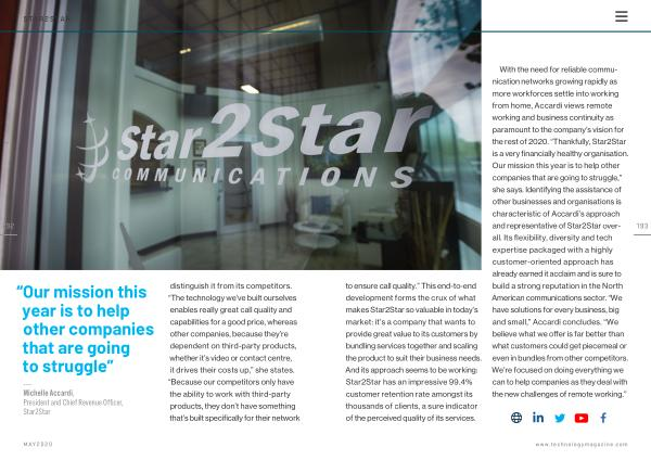 With the need for reliable communication networks growing rapidly as more workforces settle into working from home , Accardi views remote working and business continuity as paramount to the company ’ s vision for the rest of 2020 . “ Thankfully , Star2Star is a very financially healthy organisation . Our mission this year is to help other companies that are going to struggle ,” she says . Identifying the assistance of other businesses and organisations is characteristic of Accardi ’ s approach and representative of Star2Star overall . Its flexibility , diversity and tech expertise packaged with a highly customer-oriented approach has already earned it acclaim and is sure to build a strong reputation in the North American communications sector . “ We have solutions for every business , big and small ,” Accardi concludes . “ We believe what we offer is far better than what customers could get piecemeal or even in bundles from other competitors . We ’ re focused on doing everything we can to help companies as they deal with the new challenges of remote working .”