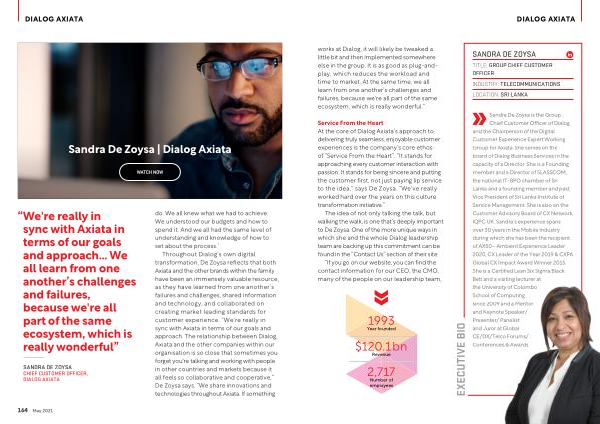 DIALOG AXIATA works at Dialog , it will likely be tweaked a little bit and then implemented somewhere else in the group . It is as good as plug-andplay , which reduces the workload and time to market . At the same time , we all learn from one another ’ s challenges and failures , because we ' re all part of the same ecosystem , which is really wonderful .” Service From the Heart At the core of Dialog Axiata ’ s approach to delivering truly seamless , enjoyable customer experiences is the company ’ s core ethos of “ Service From the Heart ”. “ It stands for approaching every customer interaction with passion . It stands for being sincere and putting the customer first , not just paying lip service to the idea ,” says De Zoysa . “ We ' ve really worked hard over the years on this culture transformation initiative .”