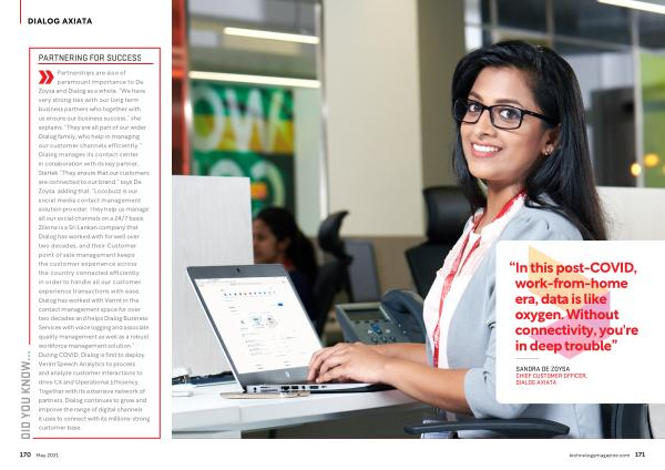 Partnerships are also of paramount importance to De Zoysa and Dialog as a whole . “ We have very strong ties with our long term business partners who together with us ensure our business success ,” she explains . “ They are all part of our wider Dialog family , who help in managing our customer channels efficiently .” Dialog manages its contact center in collaboration with its key partner , Startek . “ They ensure that our customers are connected to our brand ,” says De Zoysa , adding that , “ Locobuzz is our social media contact management solution provider . They help us manage all our social channels on a 24 / 7 basis . Zilione is a Sri Lankan company that Dialog has worked with for well over two decades , and their Customer point of sale management keeps the customer experience across the country connected efficiently in order to handle all our customer experience transactions with ease . Dialog has worked with Verint in the contact management space for over two decades and helps Dialog Business Services with voice logging and associate quality management as well as a robust workforce management solution .” During COVID , Dialog is first to deploy Verint Speech Analytics to process and analyze customer interactions to drive CX and Operational Efficiency . Together with its extensive network of partners , Dialog continues to grow and improve the range of digital channels it uses to connect with its millions-strong customer base .