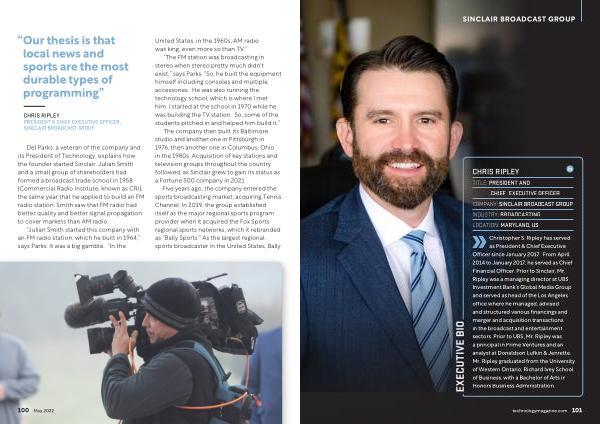 Christopher S . Ripley has served as President & Chief Executive Officer since January 2017 . From April 2014 to January 2017 , he served as Chief Financial Officer . Prior to Sinclair , Mr . Ripley was a managing director at UBS Investment Bank ’ s Global Media Group and served as head of the Los Angeles office where he managed , advised and structured various financings and merger and acquisition transactions in the broadcast and entertainment sectors . Prior to UBS , Mr . Ripley was a principal in Prime Ventures and an analyst at Donaldson Lufkin & Jenrette . Mr . Ripley graduated from the University of Western Ontario , Richard Ivey School of Business , with a Bachelor of Arts in Honors Business Administration .