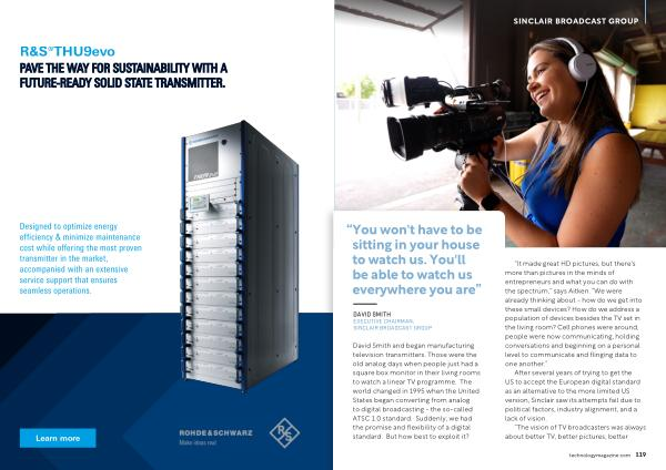 David Smith and began manufacturing television transmitters . Those were the old analog days when people just had a square box monitor in their living rooms to watch a linear TV programme . The world changed in 1995 when the United States began converting from analog to digital broadcasting - the so-called ATSC 1.0 standard . Suddenly , we had the promise and flexibility of a digital standard . But how best to exploit it ?