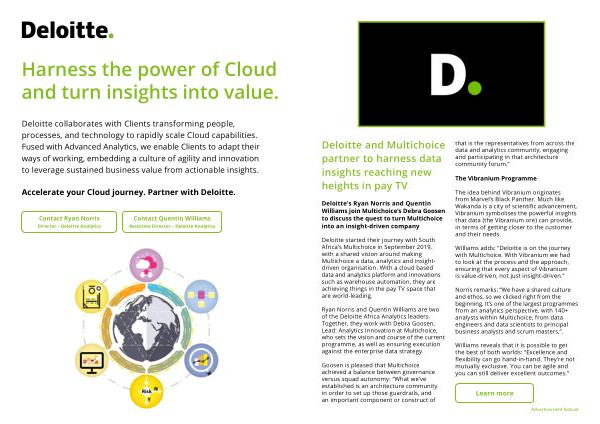 Deloitte collaborates with Clients transforming people , processes , and technology to rapidly scale Cloud capabilities . Fused with Advanced Analytics , we enable Clients to adapt their ways of working , embedding a culture of agility and innovation to leverage sustained business value from actionable insights .