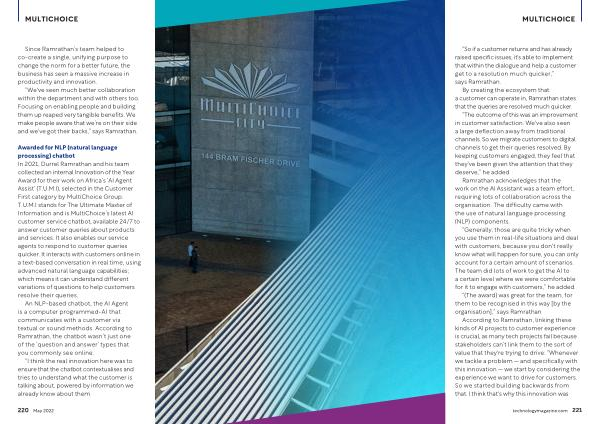 Awarded for NLP ( natural language processing ) chatbot In 2021 , Durrel Ramrathan and his team collected an internal Innovation of the Year Award for their work on Africa ’ s ‘ AI Agent Assist ’ ( T . U . M . I ), selected in the Customer First category by MultiChoice Group . T . U . M . I stands for The Ultimate Master of Information and is MultiChoice ’ s latest AI customer service chatbot , available 24 / 7 to answer customer queries about products and services . It also enables our service agents to respond to customer queries quicker . It interacts with customers online in a text-based conversation in real time , using advanced natural language capabilities ; which means it can understand different variations of questions to help customers resolve their queries .