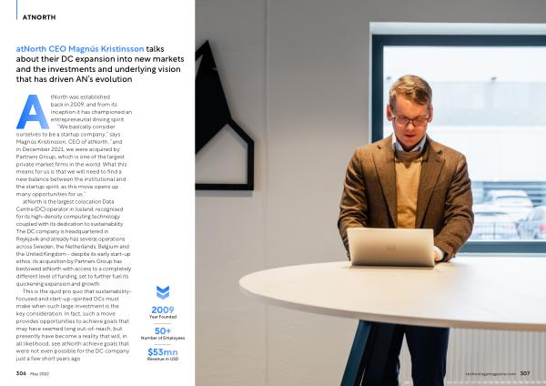 “ We basically consider ourselves to be a startup company ,” says Magnús Kristinsson , CEO of atNorth , “ and in December 2021 , we were acquired by Partners Group , which is one of the largest private market firms in the world . What this means for us is that we will need to find a new balance between the institutional and the startup spirit , as this move opens up many opportunities for us .” atNorth is the largest colocation Data Centre ( DC ) operator in Iceland , recognised for its high-density computing technology coupled with its dedication to sustainability . The DC company is headquartered in Reykjavik and already has several operations across Sweden , the Netherlands , Belgium and the United Kingdom - despite its early start-up ethos , its acquisition by Partners Group has bestowed atNorth with access to a completely different level of funding , set to further fuel its quickening expansion and growth .