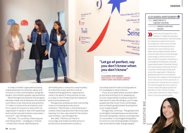 Director IT , Digital & Innovation North America at Sodexo , CK Franchising Inc . Alexandra supports the Home Care Segment , where she has been responsible for leading enterprise architecture , data initiatives , and other various digital transformation and innovation projects that leverage technology to enhance the lives of their clients & caregivers . Alexandra is a SoTogether Ambassador driving & supporting Sodexo ’ s Diversity , Equity & Inclusion goals enhancing women ’ s individual and professional growth across the organisation . Alexandra graduated with honors from Brock University with a degree in Sociology and minor in Business Communications . In her spare time , Alexandra has a passion for mentoring girls & women early on in their career through programmes like Girls in Tech Toronto or other community initiatives to help connect them to the best opportunities .