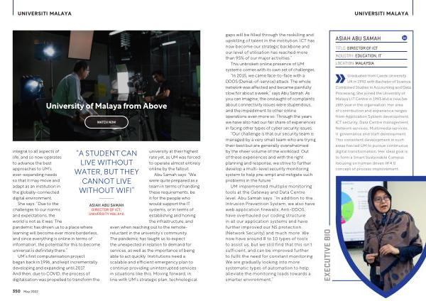 UM implemented multiple monitoring tools at the Gateway and Data Centre level . Abu Samah says : “ In addition to the Intrusion Prevention System , we also have web application firewalls , Anti-DDOS , have overhauled our coding structure in all our application systems and have further improved our NS protection ( Network Security ) and much more . We now have around 8 to 10 types of tools to assist us , but we still find that this isn ' t sufficient , and can be improved further to fulfil the need for constant monitoring . We are gradually looking into more systematic types of automation to help alleviate the monitoring loads towards a smarter environment .” EXECUTIVE BIO