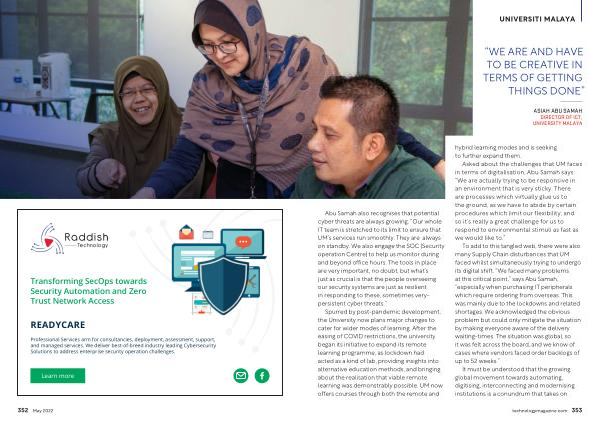 Abu Samah also recognises that potential cyber threats are always growing . “ Our whole IT team is stretched to its limit to ensure that UM ’ s services run smoothly . They are always on standby . We also engage the SOC ( Security operation Centre ) to help us monitor during and beyond office hours . The tools in place are very important , no doubt , but what ’ s just as crucial is that the people overseeing our security systems are just as resilient in responding to these , sometimes verypersistent cyber threats .”