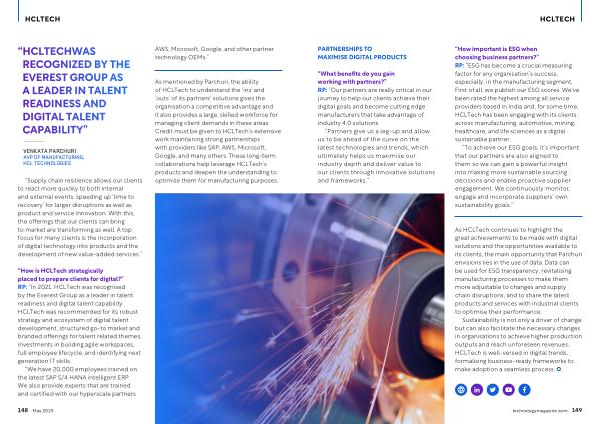 “ How important is ESG when choosing business partners ?” RP : “ ESG has become a crucial measuring factor for any organisation ’ s success , especially , in the manufacturing segment . First of all , we publish our ESG scores . We ' ve been rated the highest among all service providers based in India and , for some time , HCLTech has been engaging with its clients across manufacturing , automotive , mining , healthcare , and life sciences as a digital sustainable partner .