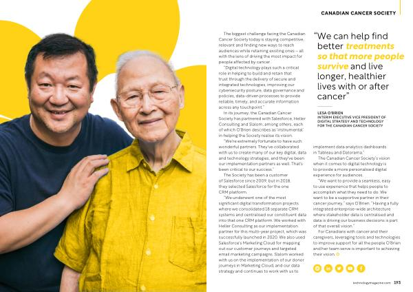 For Canadians with cancer and their caregivers , leveraging tools and technologies to improve support for all the people O ’ Brien and her team serve is important to achieving their vision . technologymagazine . com 193