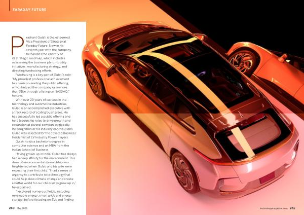 Prashant Gulati is the esteemed Vice President of Strategy at Faraday Future . Now in his seventh year with the company , he handles the entirety of its strategic roadmap , which includes overseeing the business plan , mobility initiatives , manufacturing strategy , and directing fundraising efforts .
