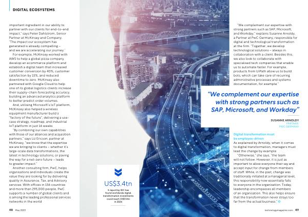 “ We complement our expertise with strong partners such as SAP , Microsoft , and Workday ,” explains Susanne Arnoldy , a Partner at PwC Germany , responsible for digital and technological transformation at the firm . “ Together , we develop technological solutions – always in collaboration with a client . Besides this , we also look to collaborate with specialised tech companies that enable us to automate faster . For example , products from UiPath allow us to build bots , which can take care of recurring administrative processes and systems documentation , for example .”