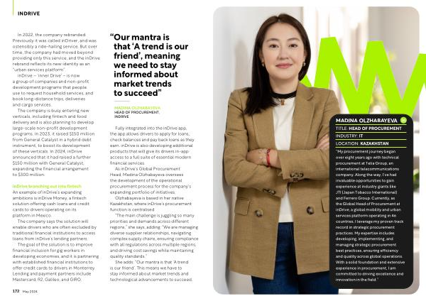 “ My procurement journey began over eight years ago with technical procurement at Telia Group , an international telecommunications company . Along the way , I ’ ve had invaluable opportunities to gain experience at industry giants like JTI ( Japan Tobacco International ) and Ferrero Group . Currently , as the Global Head of Procurement at inDrive , a global mobility and urban services platform operating in 46 countries , I leverage my proven track record in strategic procurement practices . My expertise includes developing , implementing , and managing strategic procurement best practices , ensuring efficiency and quality across global operations . With a solid foundation and extensive experience in procurement , I am committed to driving excellence and innovation in the field .”