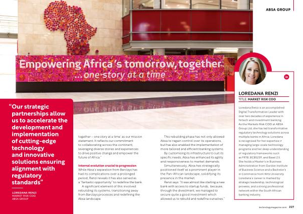 Loredana Renzi is an accomplished Digital Transformation Leader with over two decades of experience in fintech and investment banking . As the Markets Risk COO at ABSA Group Ltd , she has led transformative regulatory technology solutions across multiple banks in Africa . Loredana is recognised for her expertise in managing large-scale technology programs and her deep understanding of regulatory frameworks such as FRTB , BCBS239 , and Basel 2.5 . She holds a Master ’ s in Business Administration from Gordon Institute of Business Science and a Bachelor ’ s in Commerce from Wits University . Loredana ’ s career is marked by strategic leadership , technological prowess , and a strong professional network within the South African banking industry .