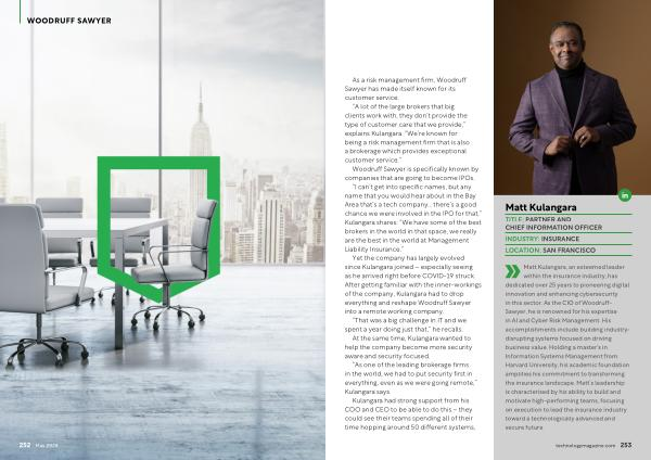 Matt Kulangara , an esteemed leader within the insurance industry , has dedicated over 25 years to pioneering digital innovation and enhancing cybersecurity in this sector . As the CIO of Woodruff- Sawyer , he is renowned for his expertise in AI and Cyber Risk Management . His accomplishments include building industrydisrupting systems focused on driving business value . Holding a master ’ s in Information Systems Management from Harvard University , his academic foundation amplifies his commitment to transforming the insurance landscape . Matt ’ s leadership is characterised by his ability to build and motivate high-performing teams , focusing on execution to lead the insurance industry toward a technologically advanced and secure future . technologymagazine . com 253