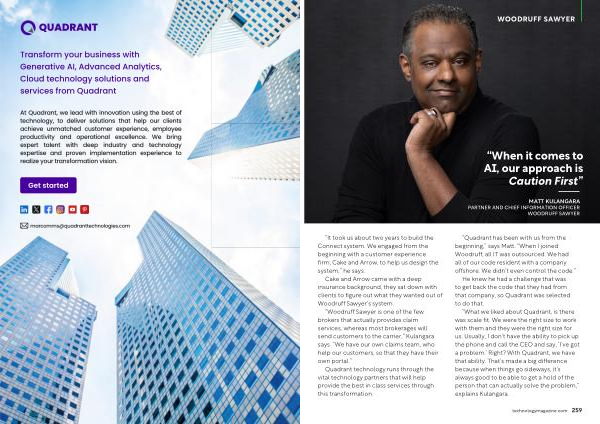 “ What we liked about Quadrant , is there was scale fit . We were the right size to work with them and they were the right size for us . Usually , I don ’ t have the ability to pick up the phone and call the CEO and say , ‘ I ’ ve got a problem .’ Right ? With Quadrant , we have that ability . That ’ s made a big difference because when things go sideways , it ’ s always good to be able to get a hold of the person that can actually solve the problem ,” explains Kulangara . technologymagazine . com 259