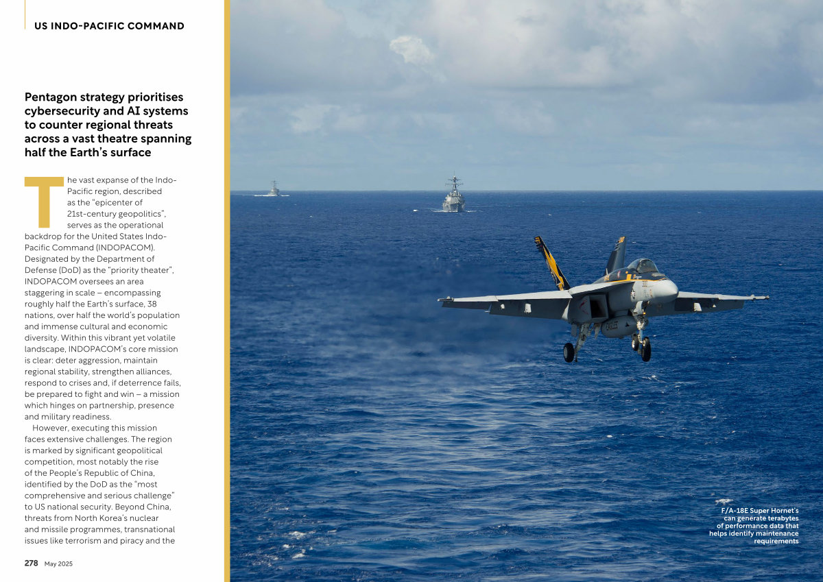 The vast expanse of the Indo- Pacific region, described as the“ epicenter of 21st-century geopolitics”, serves as the operational backdrop for the United States Indo- Pacific Command( INDOPACOM). Designated by the Department of Defense( DoD) as the“ priority theater”, INDOPACOM oversees an area staggering in scale – encompassing roughly half the Earth’ s surface, 38 nations, over half the world’ s population and immense cultural and economic diversity. Within this vibrant yet volatile landscape, INDOPACOM’ s core mission is clear: deter aggression, maintain regional stability, strengthen alliances, respond to crises and, if deterrence fails, be prepared to fight and win – a mission which hinges on partnership, presence and military readiness.
