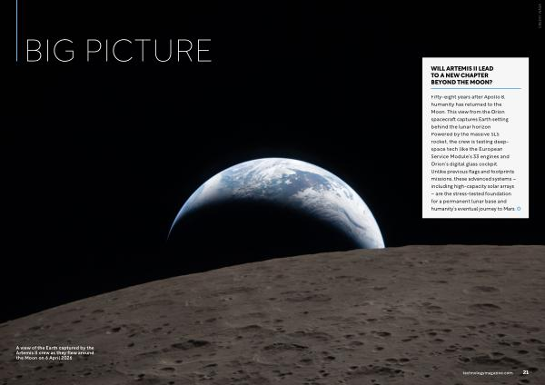 Fifty-eight years after Apollo 8, humanity has returned to the Moon. This view from the Orion spacecraft captures Earth setting behind the lunar horizon. Powered by the massive SLS rocket, the crew is testing deepspace tech like the European Service Module’ s 33 engines and Orion’ s digital glass cockpit. Unlike previous flags and footprints missions, these advanced systems – including high-capacity solar arrays – are the stress-tested foundation for a permanent lunar base and humanity’ s eventual journey to Mars.