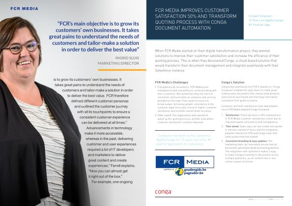 When FCR Media started on their digital transformation project , they wanted solutions to improve their customer satisfaction and increase the efficiency of their quoting process . This is when they discovered Conga , a cloud-based solution that would transform their document management and integrate seamlessly with their Salesforce instance .