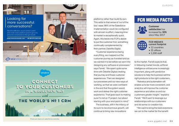 EUROPE platforms rather than build its own . This adds to that sense of ‘ out of the box ’ ease ; 98 % of the Salesforce implementation could be configured with almost no effort , meaning time to market is exceptionally quick . Again , this feeds into FCR ’ s desire to put the customer first , something continually complemented by their partner , Deloitte Digital .