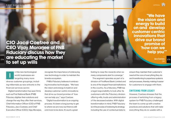 The segment operates as part of a division of FirstRand Bank Limited and is one of the largest financial institutions in the country . As a fiduciary , FNB has a legal responsibility to look after its customers with the Fiduciary division offering wills , trusts and administration of the deceased estates . With digital transformation in mind , FNB Fiduciary is in the process of reviewing its strategy including the use of contextual data to ensure they maintain their customer ’ s need at the core of everything they do and transitioning to paperless systems and processes , thereby making it easier for customers to engage with them .