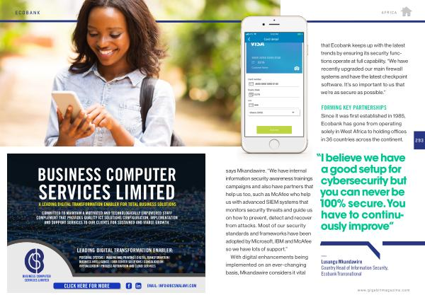 says Mkandawire . “ We have internal information security awareness trainings campaigns and also have partners that help us too , such as McAfee who help us with advanced SIEM systems that monitors security threats and guide us on how to prevent , detect and recover from attacks . Most of our security standards and frameworks have been adopted by Microsoft , IBM and McAfee so we have lots of support .”
