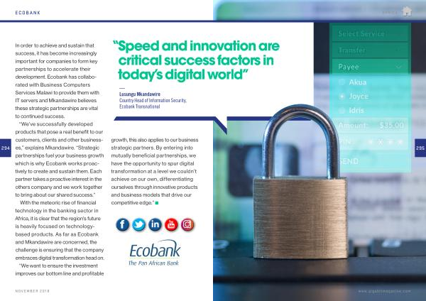 With the meteoric rise of financial technology in the banking sector in Africa , it is clear that the region ’ s future is heavily focused on technologybased products . As far as Ecobank and Mkandawire are concerned , the challenge is ensuring that the company embraces digital transformation head on . “ We want to ensure the investment improves our bottom line and profitable