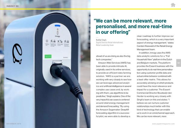 In addition , innogy uses the AWS data analytic solutions for a “ Full Household View ” platform in the Dutch and Belgium markets . The platform provides the Essent business with the opportunity to do real-time personalisation using customer profile data and actual online behavior combined with a best-offer matrix . This allows for accurately advising on which products could have the most relevance and impact for a customer . The Essent Commercial Director Boudewijn den Herder is working very closely with Singh ’ s team on this and states : “ I believe we can nurture customer relationships much better with this kind of technology that can enable us to work in an omnichannel approach . We can be more relevant , more