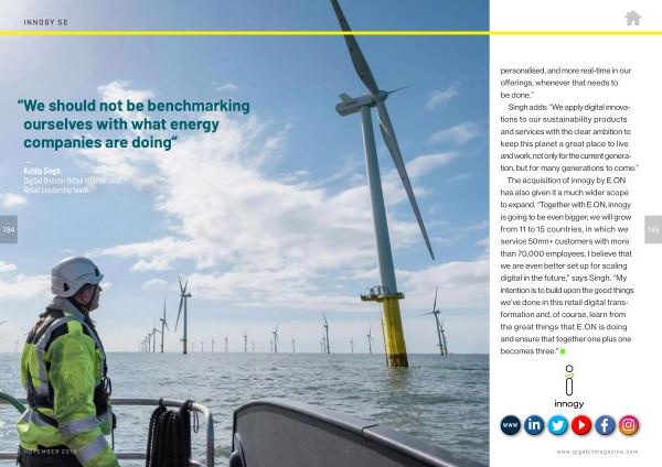 The acquisition of innogy by E . ON has also given it a much wider scope to expand . “ Together with E . ON , innogy is going to be even bigger ; we will grow from 11 to 15 countries , in which we service 50mn + customers with more than 70,000 employees . I believe that we are even better set up for scaling digital in the future ,” says Singh . “ My intention is to build upon the good things we ’ ve done in this retail digital transformation and , of course , learn from the great things that E . ON is doing and ensure that together one plus one becomes three .”