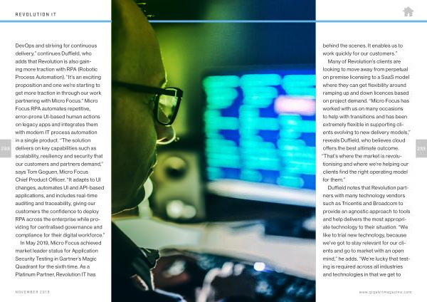DevOps and striving for continuous delivery ,” continues Duffield , who adds that Revolution is also gaining more traction with RPA ( Robotic Process Automation ). “ It ’ s an exciting proposition and one we ’ re starting to get more traction in through our work partnering with Micro Focus .” Micro Focus RPA automates repetitive , error-prone UI-based human actions on legacy apps and integrates them with modern IT process automation in a single product . “ The solution delivers on key capabilities such as scalability , resiliency and security that our customers and partners demand ,” says Tom Goguen , Micro Focus Chief Product Officer . “ It adapts to UI changes , automates UI and API-based applications , and includes real-time auditing and traceability , giving our customers the confidence to deploy RPA across the enterprise while providing for centralised governance and compliance for their digital workforce .”