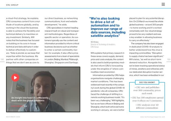 Information provided by CRU helps organisations navigate challenging market conditions . This has been evidenced most recently in the company ’ s work during the global COVID-19 pandemic . Like all companies , CRU faced the challenge of shifting to a remote working business model . “ It ’ s been very challenging ,” Will highlights , “ but as we have offices in Beijing and Shanghai , which both enforced home working in January , we were better placed to plan for any potential disruption . On 23 March we moved the whole global business – around 300 people – to home working and it ’ s worked remarkably well . Our cloud strategy proved to be very resilient and was a key enabler in allowing business to carry on effectively .”