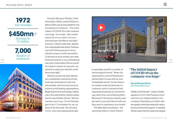 143 to specialise myself in a number of technological trends .” When the opportunity to work at Pestana presented itself , he says that he was “ immediately struck ” by the chance to combine what he ’ d learned in a customer-centric framework that augmented experiences via technology rather than overwhelming them . “ Because it ’ s the service industry , people want to see and interact with you : they want to experience your hotels .” The difficulties of lockdown - the operating milieu in which Oliveira