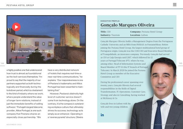 Gonçalo Marques Oliveira holds a Management Degree from the Portuguese Catholic University and an MBA from INSEAD , in Fontainebleau . Before joining the Pestana Hotel Group , the largest multinational hotel group of Portuguese origin , Gonçalo was the COO / CIO and Executive Board Member of Tranquilidade , an insurance company . Previously Gonçalo had served as CIO at Galp Energia until 2017 , which followed his 12 years at Portugal Telecom ( PT ), where he was , among other , Head of Information Systems and Board Member of PT-SI ( the IT branch of Portugal Telecom ). In March 2020 he joined the Pestana Hotel Group as member of the Executive Committee and CIO .