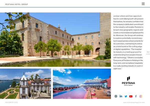 unclear where and how opportunities for controlled growth will present themselves , he remains confident that the company ’ s dedicated commitment to the industry will enable Pestana to broach new geographic regions and create a more balanced global portfolio . Moreover , the Group will continue to explore potentially revolutionary tech-based service enhancements for its customers , maintaining its status as a hotel brand at the cutting edge of digital capabilities . “ The hospitality industry is a testing ground for understanding how people interact with technology ,” Oliveira concludes . “ Everyone at Pestana is thinking in the long-term , and we believe hospitality is a really exciting industry to work in right now .”