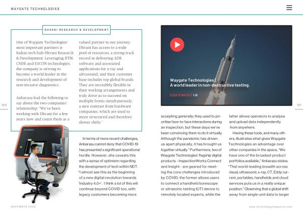 191 accepting generally ; they used to prioritise face-to-face interactions during an inspection , but these days we ’ ve been convincing them to do it virtually . Although the pandemic has driven us apart physically , it has brought us together virtually .” Furthermore , two of Waygate Technologies ’ flagship digital products - InspectionWorks Connect and Insight - are geared for meeting the core challenges introduced by COVID : the former allows users to connect a handheld borescope or ultrasonic testing ( UT ) device to remotely located experts , while the latter allows operators to analyse and upload data independently from anywhere .
